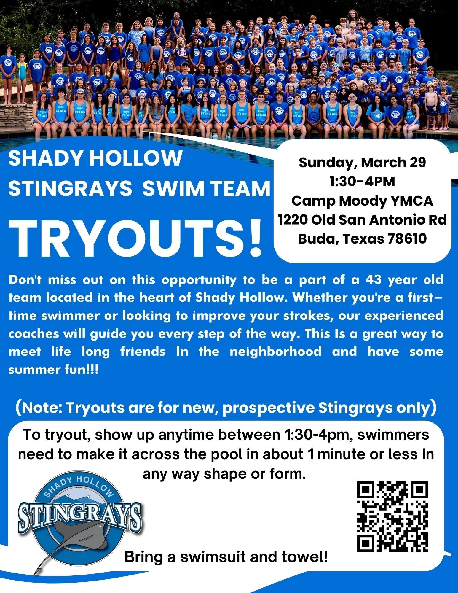 Stingray Swim Team Tryouts Sunday, March 29, 2026 1:30 PM 4:00 PM 13:30 16:00 Camp Moody YMCA 1220 Old San Antonio Road Buda, TX, 78610 United States (map) Google Calendar ICS